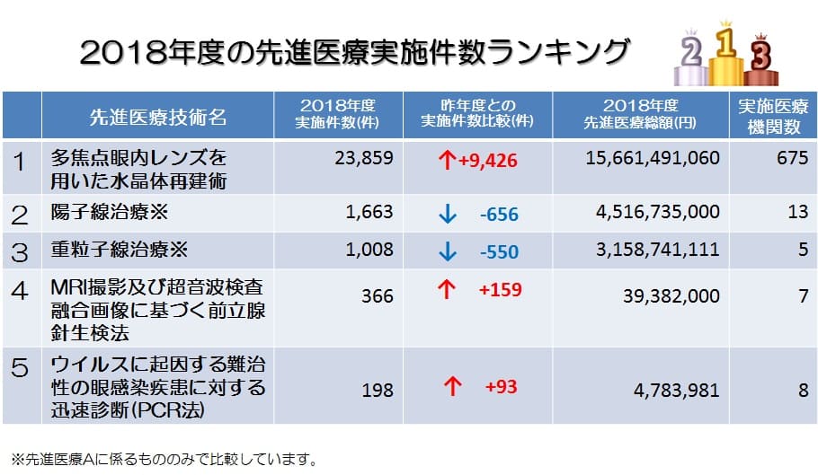 また、昨年度先進医療実施件数ランキング2位であった「前眼部三次元画像解析」は、2018年4月に保険適用となりました。この検査は1件あたりの費用が高額ではないため金額への影響は少なく、2018年度先進医療実績の患者数減少と費用増加の要因であったと推測されます。
