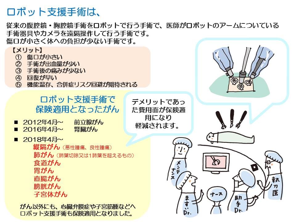 さらに同時期に、ロボット支援手術に対する保険適用も拡大となりました。これまでは前立腺がんと腎臓がんの手術だけでしたが、胃がんや肺がんなど、患者数の多い病気の手術を含む12術式のロボット支援手術が健康保険適用となりました。