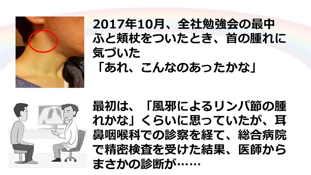 2017年12月、38歳だったティーペック社員花木は、中咽頭がんの宣告を受け、治療を開始。現在は復職を果たしている。