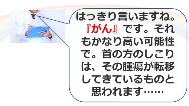 「ええ、はっきり言いますね。『がん』です。かなり高い可能性で。首の方のしこりは、その腫瘍が転移してきているものと思われます」