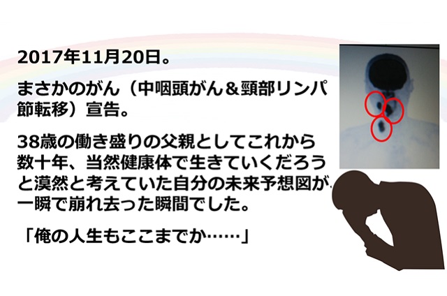 2017年12月、中咽頭がん告知を受け、標準治療(抗がん剤、放射線)を開始。翌8月に病巣が画像上消滅し、9月より復職。がん判明後より、ブログ『38歳2児の父、まさかの中咽頭がんステージ4体験記! 〜がんチャレンジャーとしての日々〜』を開始し、現在も執筆中。