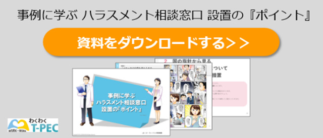 従業員のハラスメント対策にお役立て頂ける資料『事例に学ぶ ハラスメント相談窓口 設置のポイント』をダウンロードする>>