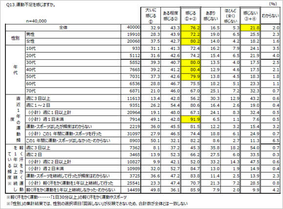 スポーツ庁では、スポーツの実施状況等に関する国民の意識を把握し、今後の施策の参考とすることを目的に、毎年、全国の18歳~79歳の男女40,000人を対象に「スポーツの実施状況等に関する世論調査」を行っています。令和5年3月24日に公表した「令和4年度スポーツの実施状況等に関する世論調査」によると、運動不足を「感じる」(「大いに感じる」+「ある程度感じる」)と答えた人は、全体の76.2%にも及んでいます(令和3年度は77.9%)。