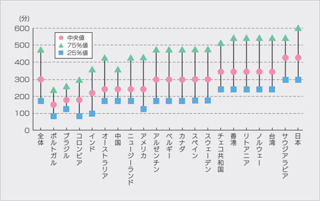 図2の●印は各国の座位時間の中央値で、■は下から4分の1、▲は下から4分の3の位置に当たる人の座位時間をそれぞれ表しています。これを見ると、世界20か国の中で日本人の座位時間が一番長く、座りすぎのリスクが大きいことがわかります。