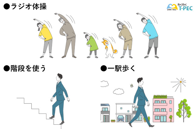 職場での運動・身体活動量を増やすためには、以下のような方法が考えられます。