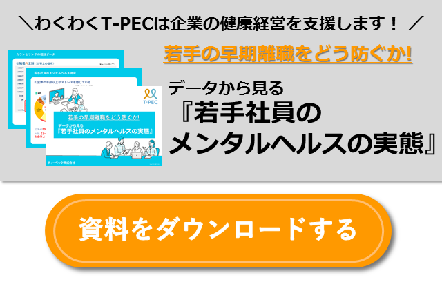 近年、若手社員の3年以内の早期離職は3割を超えているといわれており、多くの企業で課題となっています。ティーペックでは、コロナ禍に入社した若手社員を対象に「メンタルヘルス調査」を行いました。その結果、若手社員の離職意思やストレスの実態が見えてきました。