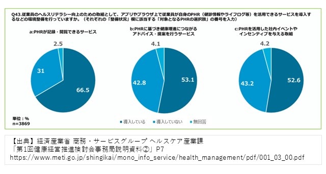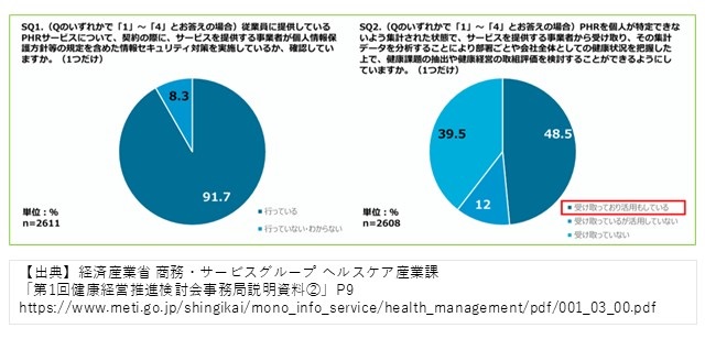 経済産業省は「PHRの活用は、健康状態の可視化を通じ健康経営の質の向上に繋がると考えられるため、次年度調査では、 より深掘りして問うこととしてはどうか」という提案をしています。