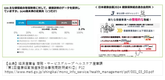 一方、図表6に示されているように、40歳未満の従業員に関する健診データを保険者へ提供している法人は8割(79.6%)です。40歳未満の健診データを活用した若年層対策を行っている健保組合は約3割というデータもあるため、経済産業省は「次年度も引き続き状況把握を行う」という方針を示しています。