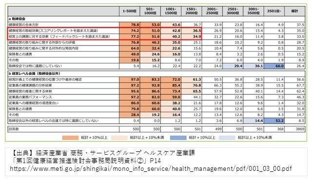 また、企業における健康経営の取組について、取締役会など経営レベルでその効果を議論している法人は約3割にとどまっています。ただし、上位法人ほどフィードバックシート等を活用した議論をしているとのデータもあり、下位法人にもフィードバックシート等を活用した議論が広がることが期待されます。
