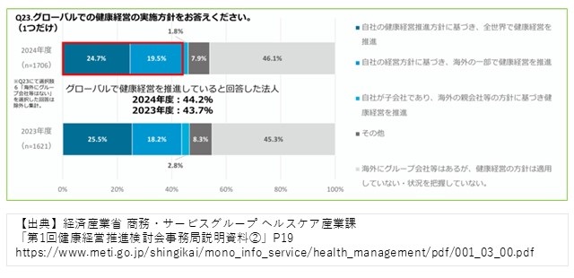 自社の健康経営推進方針に基づき、グローバルで健康経営を推進する法人は約44%(図表10の棒グラフ赤枠部分)となっています。これまでの調査等により、制度や文化の違いから国ごとに取組内容に差があること、また日本本社の関与レベルにも差があることがわかっています。