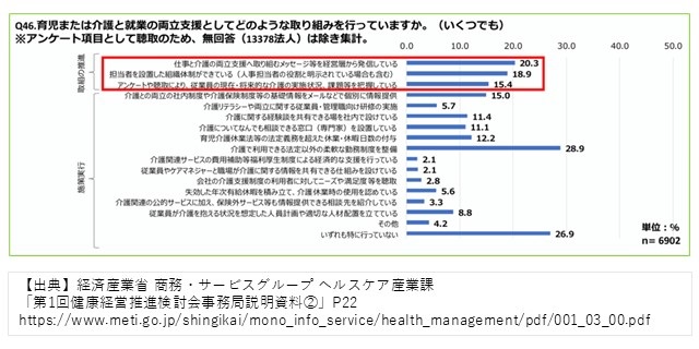 経営層のコミットメントがある法人は2割(20.3%)あるものの、その後の実態把握・施策実行が課題となっています。中小企業単独で実態把握の調査や従業員ニーズに基づいた施策検討を進めることが困難である場合も多く見られ、企業側の意識啓発と並行して両立支援のための外部支援者を育成していくことも課題です。今年度の調査結果を踏まえ、経済産業省は「次年度以降は、中小規模法人部門についても評価項目として追加してはどうか」という提案をしています。