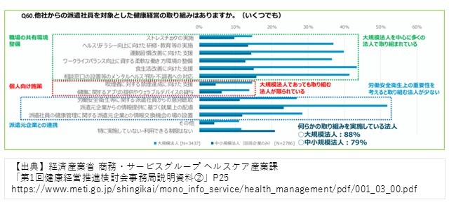 他社からの派遣社員がいる大規模法人の88%、中小規模法人の79%が、健康経営に関する何らかの取組を実施していると回答しています。 正社員と共有した職場の環境整備の割合は高い一方、個人向けの施策や派遣元法人との連携が必要な施策の取組割合は低いといえます。