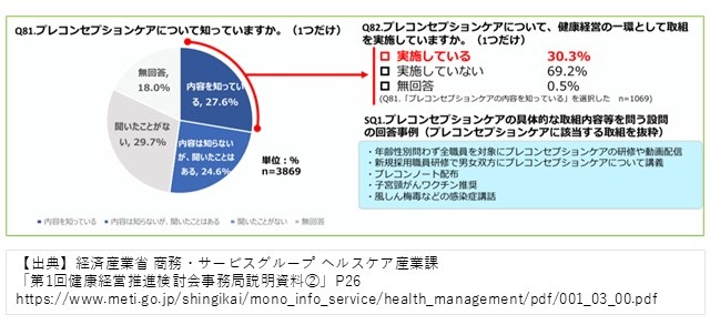 プレコンセプションケアとは、「男女ともに性や妊娠に関する正しい知識を身に付け、健康管理を行うよう促すこと」を意味します。この「内容を知っている」法人は全体の3割程度(27.6%)で、そのうち「取組を実施している」法人は3割程度(30.3%)にとどまっています。