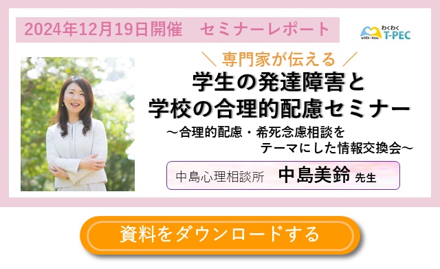 2024年12月19日、ティーペック株式会社では、学校法人向けセミナー「専門家が伝える『学生の発達障害と学校の合理的配慮』セミナー〜合理的配慮・希死念慮相談をテーマにした情報交換会〜」を開催しました。