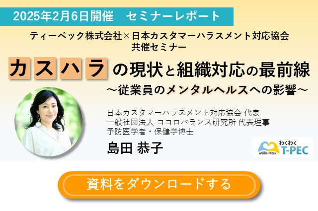 2025年2月、ティーペック株式会社は日本カスタマーハラスメント対応協会と共催で、オンラインセミナー「カスハラの現状と組織対応の最前線〜従業員のメンタルヘルスへの影響〜」を行いました。