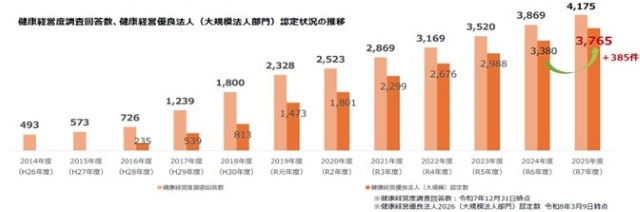 2025年度の大規模法人における健康経営度調査の回答数は4,175件、また健康経営優良法人2026の認定数は、前年度より385件増えて3,765社となりました。認定数は2016年度の235件と比べて約16倍に増えています。