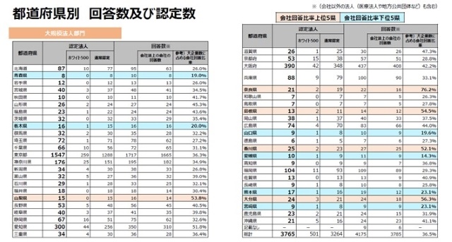 都道府県別の大規模法人の回答比率を見ると、上位5県は山梨県、奈良県、島根県、香川県、大分県である一方、下位5県は青森県、栃木県、山口県、愛媛県、熊本県、宮崎県(熊本県と宮崎県が同率1位)でした。