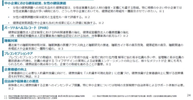 政府で検討されている「攻めの予防医療」の方針に合わせて、女性特有の健康課題や睡眠対策、プレコンセプションケア等について、中小企業でも無理なく始められる取組として整理し、段階を踏みながら実際の行動につなげる支援策として展開していくことが求められています。